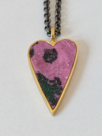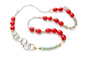 Zu den aktuellen Arbeiten von Alkie Osterland gehören Broschen, die Edelsteine mit Glassteinen kombinieren und lange wechselvolle Colliers.