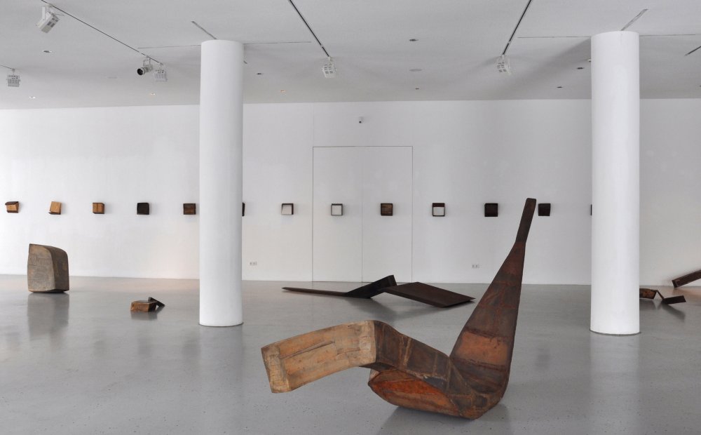 Das konstruktive Verfahrensprinzip setzt sich fort in einem Dualismus des Materials: Holz, gebraucht und abgenutzt, und Eisen werden ungeschönt eingesetzt. Bewusst tragen die Arbeiten alle Zeichen ihrer Entstehung: Spuren von Säge, Hobel und Stechbeitel, Rost, Schweißnähte und freiliegende Schraubenköpfe. Während Holz als alter Werkstoff für konstruierende Eingriffe des Menschen steht, bringt Eisen natürliche materialtypische Momente ins Spiel. Daraus entwickelt sich ein materieller Dialog von großem Spannungsreichtum.