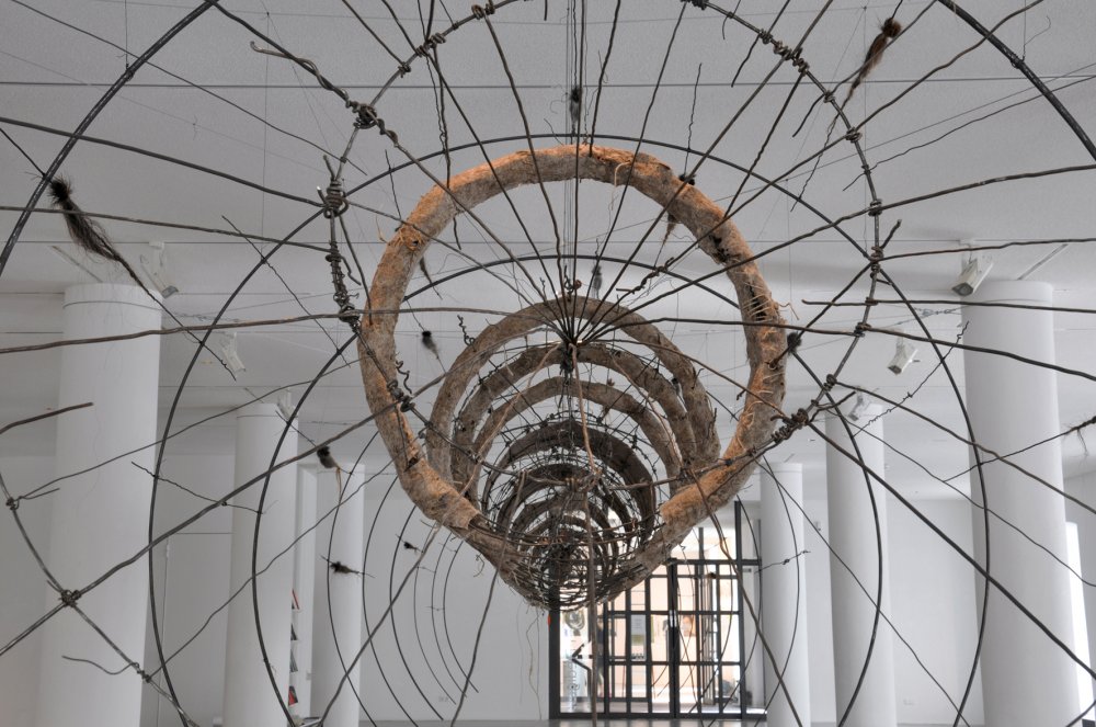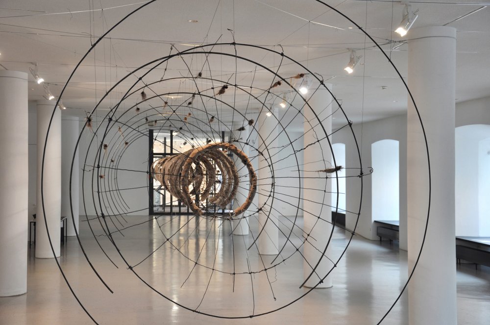 Wie alle Arbeiten des Künstlers bezieht sich auch die Skulptur „Holon“ auf den Raum. Es geht um Räumlichkeit als Ganzes und um die Balance verschiedener Aspekte, um innen und außen, stabil und fragil, leicht und schwer, hart und weich, natürlich und künstlich. Die unkonventionellen, großteils vergänglichen Materialien – mongolischer Filz, Rosshaar, Hanfschnüre und Eisendraht – geben der Form eine ganz eigene stoffliche Qualität. Sie verweisen in ihrem fragmentarischen Erscheinen auf die Zeitlosigkeit natürlicher Zyklen, auf Werden und Vergehen. Das plastische Liniengefüge des Eisendrahts lässt ein nahezu endlos fortführbares Beziehungsgeflecht entstehen, das sich jeder Begrenzung widersetzt und neue räumliche wie auch zeitliche Relationen eröffnet. Die ganze Arbeit evoziert ein Dazwischen: zwischen fester Form und Flüchtigem, Entschiedenem und Unentschiedenem, Geschlossenheit und Durchlässigkeit. Als raumgreifende, dreidimensionale „Zeichnung im Raum“ ist die Skulptur nur im Wechsel von Fern- und Nahwahrnehmung erfass- und erfahrbar – sie muss ergangen und umschritten werden.