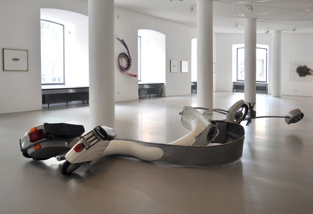 Stefan Rohrer weiß um die Emotionen, die das Automobil zu wecken vermag und spielt gleichzeitig mit ihnen auf originelle Weise. Von Jugend an ein Autonarr, verwendet er Autokarosserien, Motorroller und Modellautos für seine Skulpturen und Objekte, mit denen er in der zeitgenössischen Bildhauerei eine ebenso eigenständige wie unverwechselbare Position bezieht. Mit größter handwerklicher Finesse nimmt er das Ausgangsmaterial auseinander, verlängert, verdreht, kombiniert und montiert es zu dynamischen Gebilden, die ihre Herkunft zwar erkennen lassen, im Prozess der schöpferischen Umgestaltung aber in den Bereich der Fantastik transformiert werden. Mal elegant geschwungen, mal in wilden Loopings greifen die Objekte in den Raum aus, heben gleichsam ab und geraten aus der Bahn. Finden und Erfinden, Vertrautes und Fremdes greifen ineinander. Realität und Fantasie finden spannungsreich zusammen.