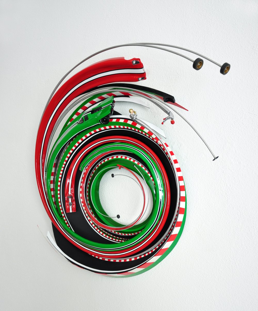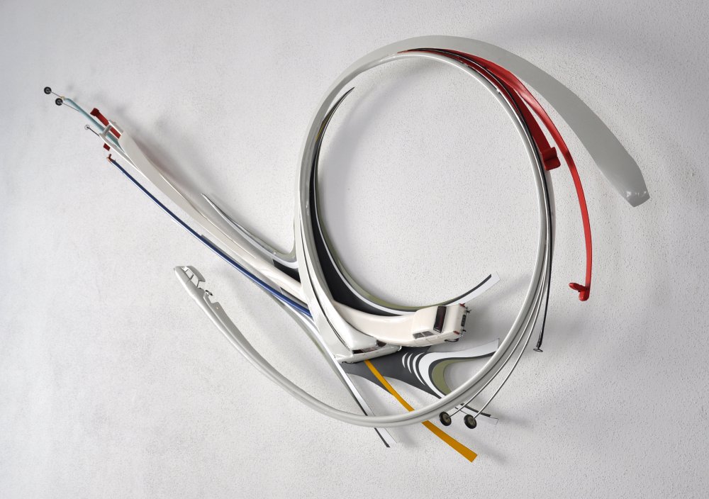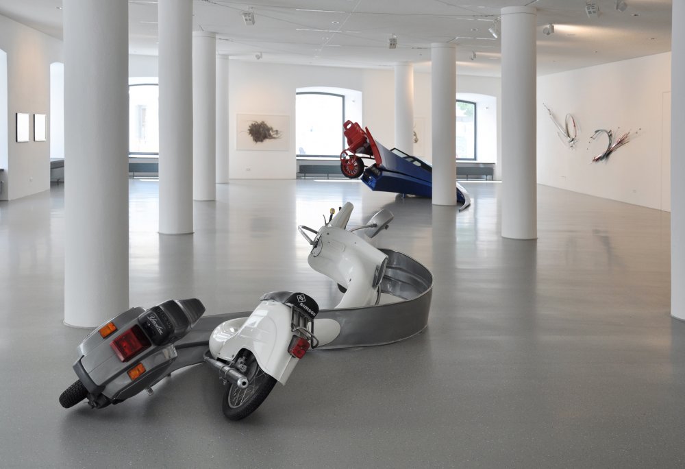 „Ich liebe Autos“, bekennt Stefan Rohrer, „aber sie bleiben bei mir einfach nicht ganz.“ Der Stuttgarter Künstler zerlegt Autokarosserien, Motorroller und Modellautos. Die zerteilten Formen streckt, staucht und dreht, verlängert, verschraubt und verschweißt er. Neu kombiniert, entstehen dynamisch bewegte, popfarben lackierte und auf Hochglanz polierte Skulpturen – wie der „Roller Coaster“ (zu Deutsch: „Achterbahn“). In der über sieben Meter langen, raumgreifenden Skulptur sind die Teile einer „Vespa“ und ihres DDR-Pendants, einer „Schwalbe“, verschweißt und in Schleifen und Schwüngen gedehnt – eine sinnliche Allegorie auf die Wiedervereinigung von Ost und West. Titelgebend ist der „Roller Coaster“ nun für eine Ausstellung vom 8. Juli bis 10. September in der Galerie im Prediger. Einen Schwerpunkt der in Kooperation mit der Galerie Scheffel, Bad Homburg v.d.H., entstandenen Schau bilden sieben Boden- und Wandarbeiten Stefan Rohrers der letzten sieben Jahre, darunter eigens für die Ausstellung entstandene, noch nie gezeigte Werke. Zu den plastischen Arbeiten kommen Zeichnungen, die im Schaffen des Bildhauers eine eigenständige Werkgruppe bilden.