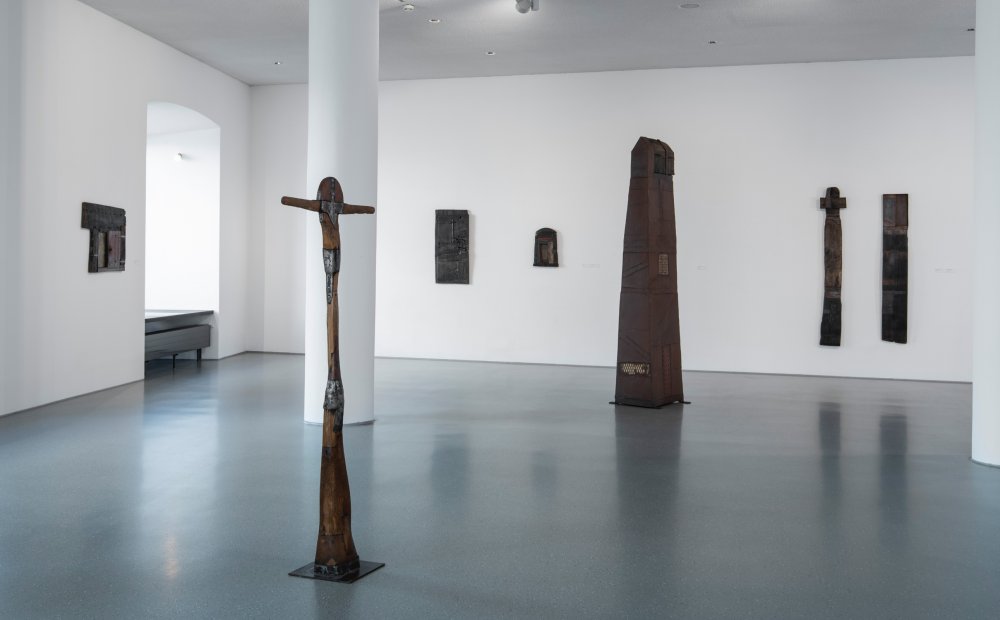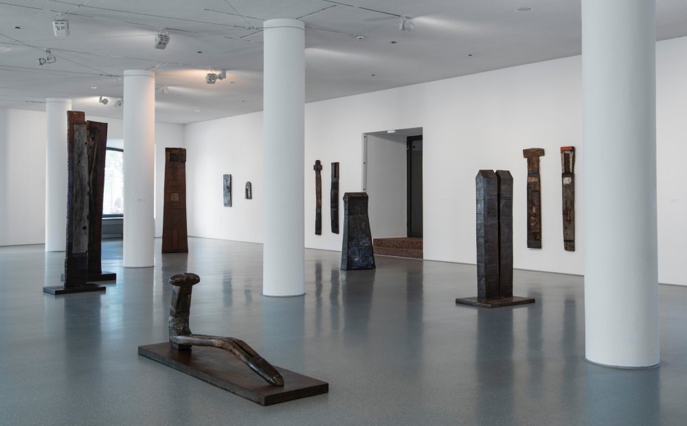 Blick in die Ausstellung, vorne links: Kreuzfigur, 1984, Holz, Eisen, H 170 cm. Foto: Frank Kleinbach -