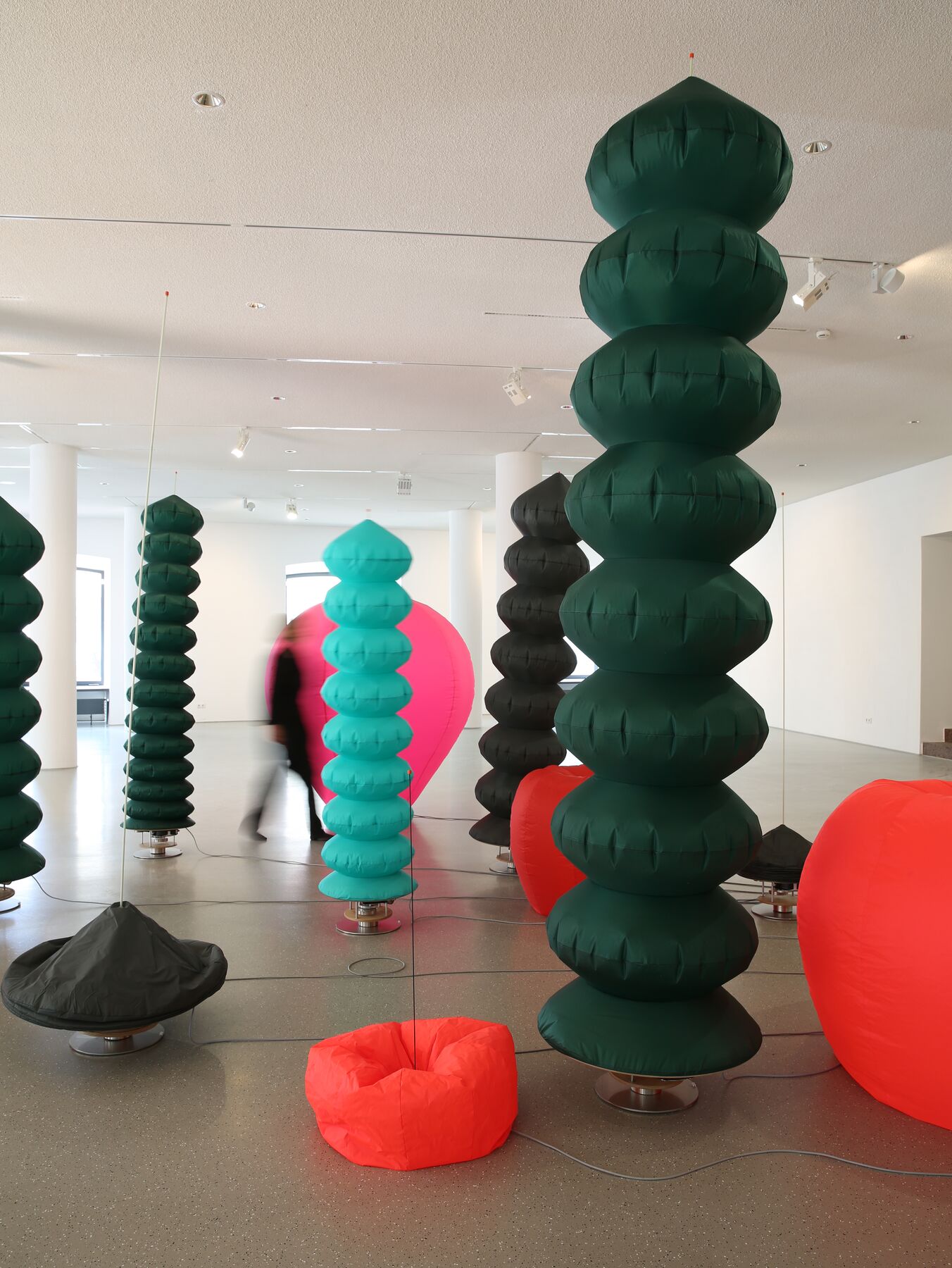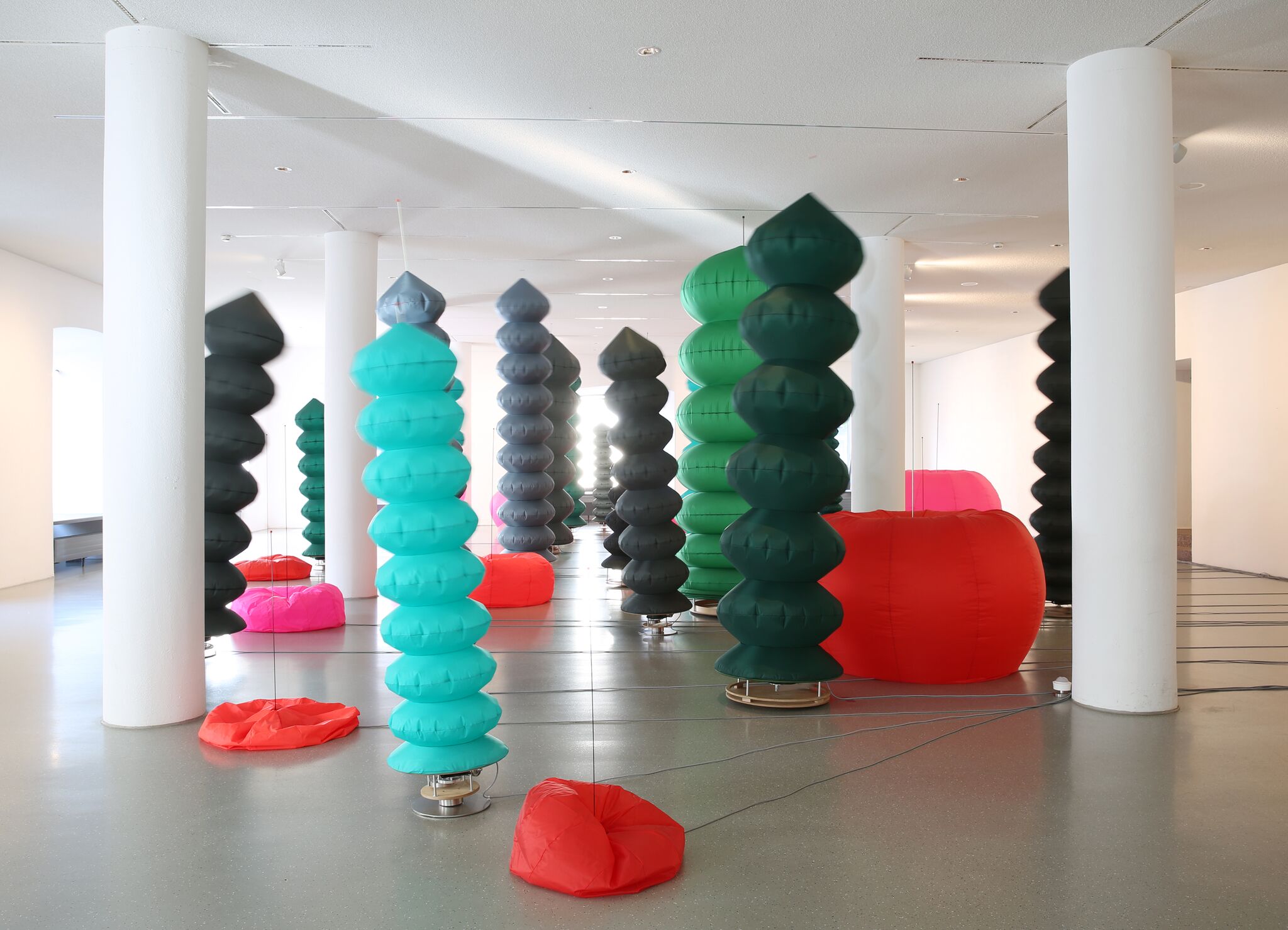 Die an- und abschwellenden roten Objekte lassen an Blütenstände oder reife Früchte denken. Die senkrecht in die Höhe wachsenden grünen Objekte erinnern an Pflanzenstängel oder Bäume. Assoziationen an ein pralles, natürliches Leben, an Fruchtbarkeit und Wachstum werden ebenso wach, wie das Wissen um den Anfang und das Ende des menschlichen Lebens, um Flüchtigkeit und Vergänglichkeit. Die atmenden Formen versinnbildlichen das Fließen von Lebensenergie und erzeugen einen Gemeinschaftskörper. Außen- und Innenraum der Skulpturen sind in einer Grenzüberschreitung verbunden. Hülle und Luftstrom bilden ein organisches Kontinuum von Atemgeben und Atemnehmen, das den Betrachtenden unmittelbar mit einbezieht und offenbart: Atmen ist ein ständiger Austausch. Wir atmen ein und nehmen die Welt in uns auf. Wir atmen aus und geben der Welt etwas von uns zurück. Wir sind, weil wir atmen. Wir sind, solange wir atmen – vom ersten Atemzug bei der Geburt, bis zum letzten beim Tod.