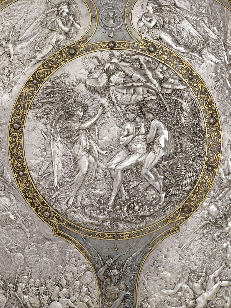 Die Vorstellung vom und die Sehnsucht nach dem Paradies, sei es als blühender Garten Eden, als Hafen des Friedens, der Freiheit und der Unbeschwertheit oder als glücklicher Urzustand allen Lebens, existiert seit ewigen Zeiten und beflügelt die menschliche Fantasie bis heute, so auch die Kunst. Der englische Barockdichter John Milton (1608-1674) hat die Geschichte von der Vertreibung aus dem Paradies 1667 in seinem Versepos „Paradise Lost“ (1667) sprachgewaltig in Worte gefasst. Ins Bild gesetzt hat sie der französische Gestalter und Silberschmied Léonard Morel-Ladeuil in Zusammenarbeit mit der englischen Silberwarenfabrik Elkington 1866 im sogenannten Milton-Schild für die Weltausstellung 1867 in Paris. Von diesem Schild besitzt das Museum im Prediger eine galvanoplastische Nachbildung aus den gleichen Materialien wie das Vorbild (Silber, Eisen, Vergoldung). Als Referenz für ihre Perspektive auf das Thema nehmen Bettina Bürkle und Klaus Illi diesen Schild in die Ausstellung auf und zeigen ihn im Dialog mit ihrer Installation.
