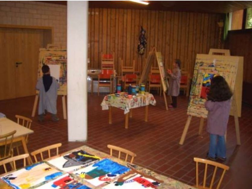 Neben den Gruppenräumen verfügt die Einrichtung über einen separaten Turnraum. Im Untergeschoss befinden sich ein großer Malraum und ein Werkraum mit Werkbänken.