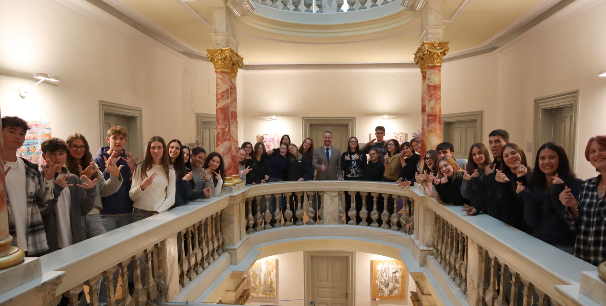 Schwäbisch Gmünd (sv). Am Montag, 6. Oktober, begrüßte der Erste Bürgermeister Christian Baron insgesamt 13 italienische Schülerinnen und Schüler mit Begleitlehrern des Istituto Oriani Gymnasiums sowie die Schülerinnen und Schüler der Gastgeberschule Hans-Baldung-Gymnasium im großen Sitzungssaal des Schwäbisch Gmünder Rathauses. Bürgermeister Baron berichtete von seinen Besuchen in der Partnerstadt Faenza und die daraus gewachsene Verbundenheit. Den Schülerinnen und Schülern gab er mit auf den Weg, dass der Schüleraustausch eine wertvolle Gelegenheit sei, um über Ländergrenzen hinweg Freundschaften zu schließen, die oft ein Leben lang bestehen.