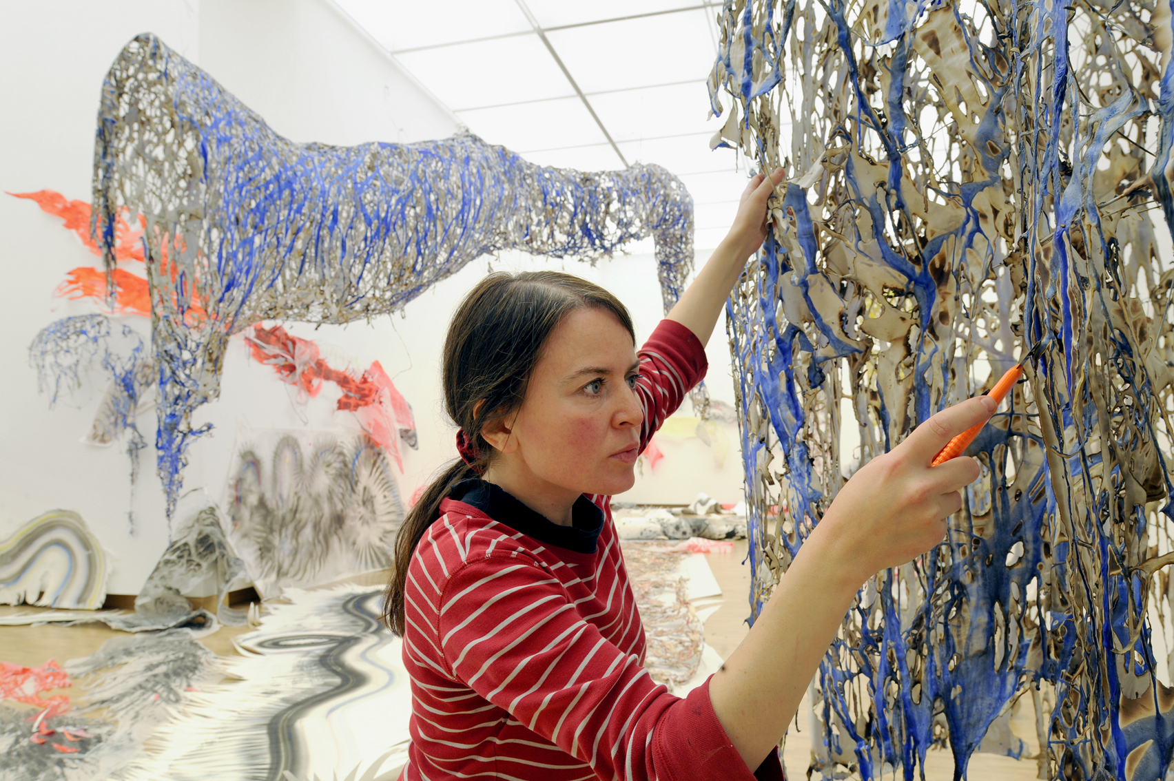 Im Herbst 2026 präsentiert die Galerie im Prediger eine Ausstellung der Preisträgerin des 22. Kunstpreises der VR-Bank Ostalb, der dieses Jahr an Nadja Schöllhammer geht. 1971 in Esslingen am Neckar geboren, lebt und arbeitet die Künstlerin heute in Berlin, wo sie auch an der Universität der Künste studiert und 2003 als Meisterschülerabschluss bei H.-J. Diehl ihren Abschluss gemacht hat. Ausgehend von der Zeichnung greifen ihre Arbeiten ins Dreidimensionale aus und entwickeln sich zu raumgreifenden Installationen. Dabei arbeitet sie mit Klebstoff, Feuer und Skalpell, um filigrane Strukturen freizulegen. Dabei spielt das Verhältnis des Körpers zum Werk eine wichtige Rolle, aber auch ihre Kindheit auf einem schwäbischen Dorf dient in den figürlichen Bestandteilen als Inspiration. Für die Ausstellung in Schwäbisch Gmünd werden neue, speziell für die Galerie im Prediger entwickelte Arbeiten entstehen. Eröffnung & Preisverleihung: Freitag, 16. Oktober, 18.30 Uhr