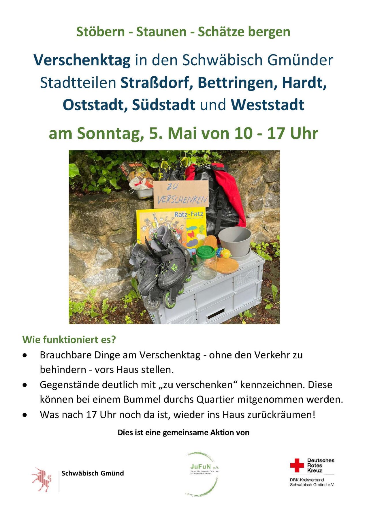 Am Sonntag 5. Mai, 10 bis 17 Uhr, kann alles, was funktionsfähig ist und ein neues Zuhause sucht, vor die Tür gestellt werden – selbstverständlich ohne den Fuß-, Rad- oder Straßenverkehr zu behindern. Was deutlich mit dem Hinweis „zu verschenken“ gekennzeichnet ist, kann mitgenommen werden. Was bis 17 Uhr keine Abnehmerin oder keinen Abnehmer gefunden hat, muss ins Haus zurück geräumt werden. Die Schätze zum Verschenken können ohne Anmeldung vor die Türe gestellt werden.