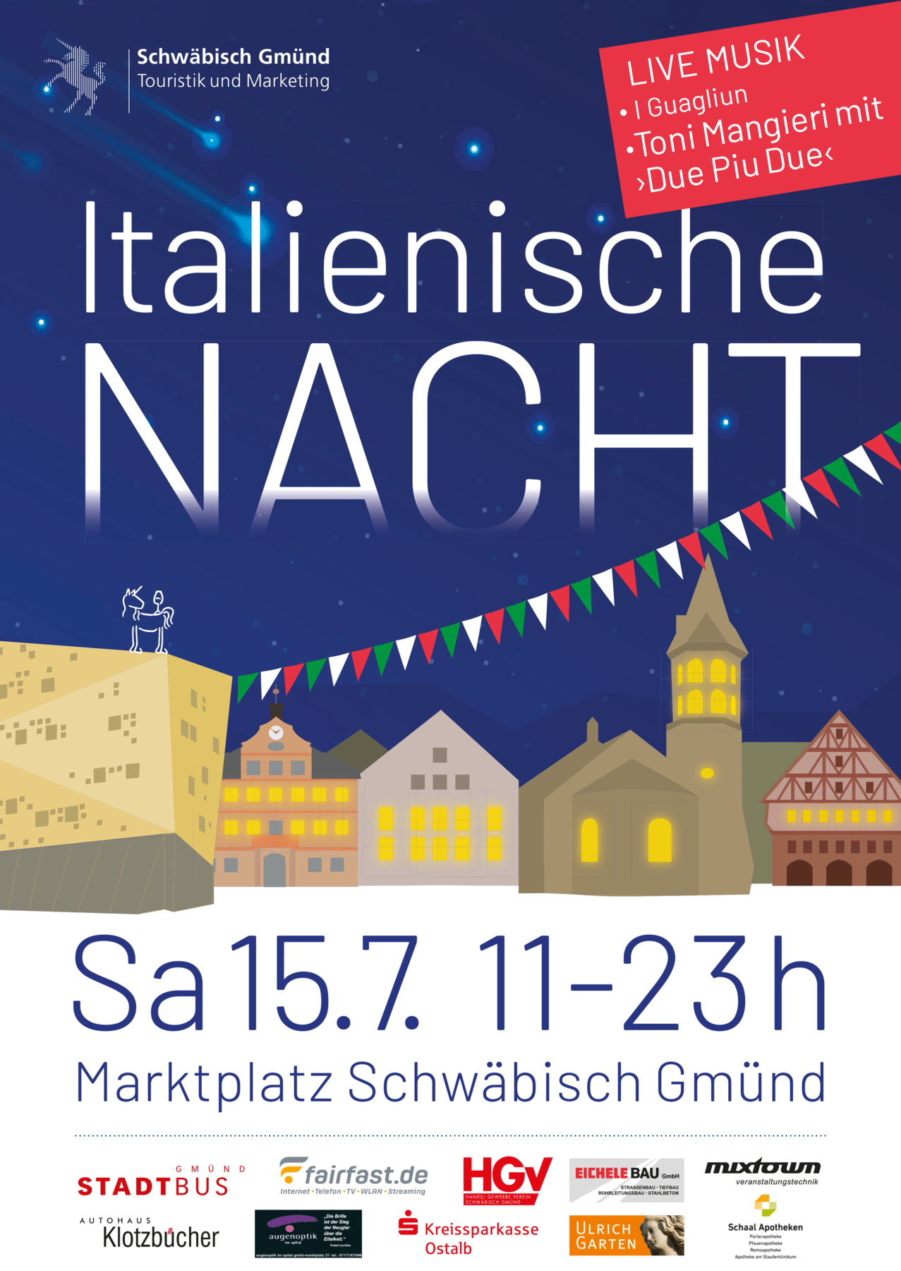 Neben der kulinarischen Vielfalt wird die Italienische Nacht auch mit Live-Musik aufwarten. Das Programm startet um 18 Uhr und endet um 23 Uhr. Um alle auf den Abend einzustimmen, wird die Band „I Guagliun“ den Abend eröffnen. Ab 20 Uhr wird dann traditionell „Due Pi Due“ die Besucher zum Tanzen und Mitsingen animieren. Der Eintritt zur Italienischen Nacht ist frei, und Alle sind herzlich eingeladen, sich diesem unvergesslichen Abend anzuschließen. Die Touristik und Marketing GmbH möchte sich herzlich bei den großzügigen Sponsoren bedanken, die diese wundervolle Veranstaltung ermöglicht haben. Ein besonderer Dank geht an die Schaal Apotheken, Kreissparkasse Ostalb, Eichele Bau, Autohaus Klotzbücher, Augenoptik im Spital, fairfast, HGV, Stadtbus und Ulrich Garten, die mit ihrem Engagement und ihrer Unterstützung die Italienische Nacht zu einem unvergesslichen Erlebnis machen. Zu erleben gibt es eine Nacht voller italienischer Leidenschaft, Kulinarik und Unterhaltung - eine Veranstaltung für die ganze Familie.