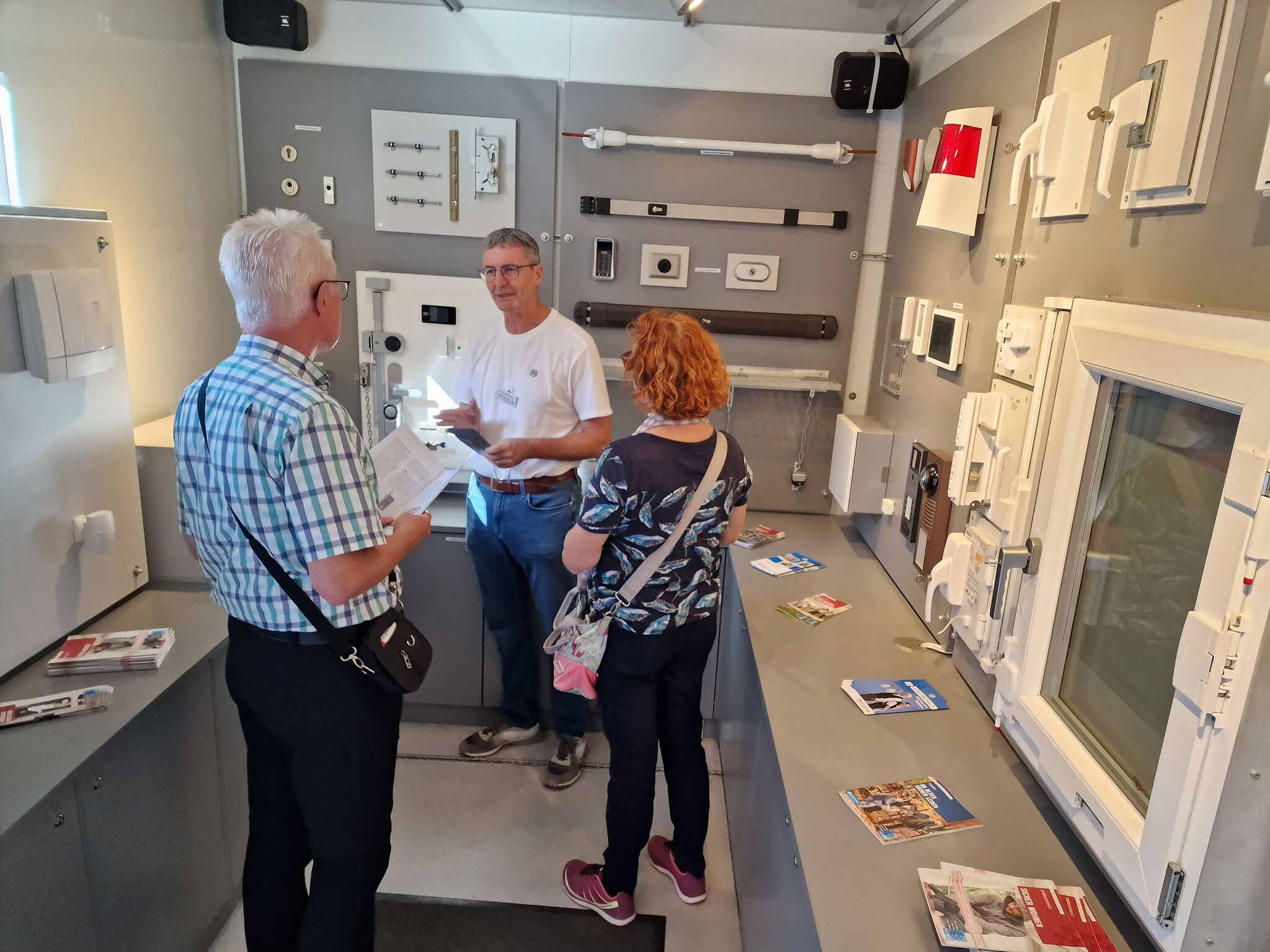 Die Polizei hat in ihrem Informationsfahrzeug viele Sicherungsmaßnahmen ausgestellt, die einen guten Schutz vor ungebetenen Gästen ermöglichen. Oft sind es kleine Verbesserungsmaßnahmen an Türen und Fenstern, die im Falle eines versuchten Einbruchs dazu führen, dass die Täter schnell von ihrem Tun ablassen. Neben diesen Möglichkeiten präsentierte die Polizei auch komplexe Sicherungsmaßnahmen für Wohngebäude. Trotz sinkender Fallzahlen geschehen nach wie vor täglich Wohnungseinbrüche, die neben dem materiellen Schaden auch eine massive psychische Belastung für die Bewohner darstellen.