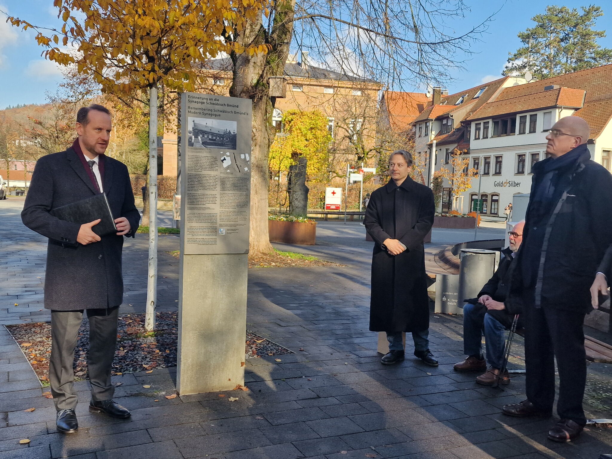 Schwäbisch Gmünd (sv). Das „Zeichen der Erinnerung“ am Josefsbach, das seit 2015 an die ehemalige Synagoge in der Katharinenstraße und an die jüdische Gemeinde Schwäbisch Gmünds erinnert, hat eine neue Informationstafel erhalten. Die bisherige Tafel war in den vergangenen zehn Jahren stark verwittert und kaum noch lesbar. Am Montag, 10. November, wurde die neue Informationsstele "Zeichen der Erinnerung" am Bockstorplatz durch den Ersten Bürgermeister Christian Baron, eingeweiht. Bürgermeister Baron würdigte das Engagement von Inge Eberle, die mit ihrer Anregung nicht nur den Austausch der verwitterten Tafel ins Rollen brachte, sondern auch eine inhaltliche Überarbeitung des Textes initiierte.