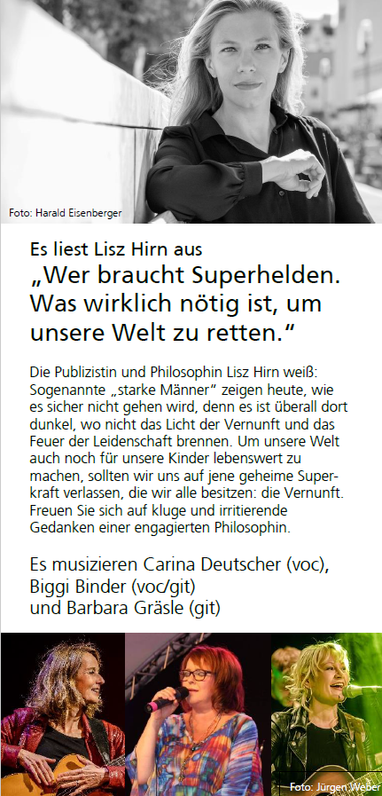 Schwäbisch Gmünd (sv). Am Mittwoch, 21. Juni, um 18 Uhr, lädt das Gmünder Frauenforum und die Stabsstelle Chancengleichheit zum Frauen-Sommer-Empfang auf die Remspark-Bühne ein. Es liest die Wiener Autorin und Philosophin Lisz Hirn aus ihrem Buch „Wer braucht Superhelden. Was wirklich nötig ist, um unsere Welt zu retten.“ Zum Inhalt: Sogenannte „starke Männer“ zeigen heute, wie es sicher nicht gehen wird, denn es ist überall dort dunkel, wo nicht das Licht der Vernunft und das Feuer der Leidenschaft brennen. Um unsere Welt auch noch für unsere Kinder lebenswert zu machen, sollten wir uns auf jene geheime Superkraft verlassen, die wir alle besitzen: die Vernunft. Dazu musizieren Carina Deutscher, Biggi Binder und Barbara Gräsle. Weitere Information gibt Elke Heer, Beauftragte für Chancengleichheit, per E-Mail: elke.heer@schwaebisch-gmeund.de oder unter der Rufnummer: 07171/603-1610.