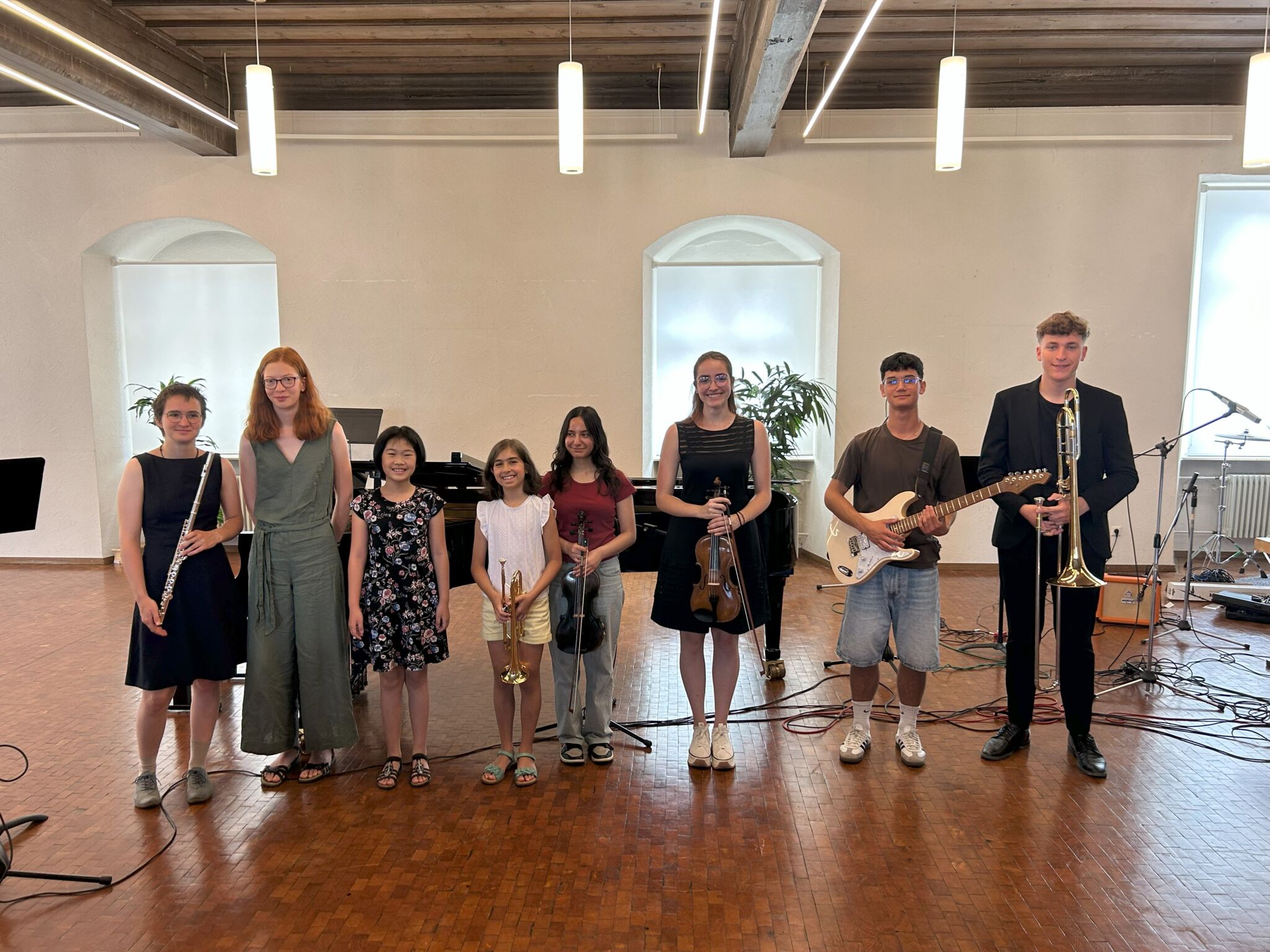Erik Heinrich an der Posaune zeigte beeindruckende Facetten in vier Variationen mit dem "Zürcher Marsch" von Jan Koetsier, Beren Bilgili sorgte mit der "Malaguena" von Pablo de Saraste auf der Violine für spanisches Flair und Lea Kaiser an der Querflöte nahm das Publikum auf eine träumerische Reise nach Frankreich mit dem „Abend in den Bergen“ (soir dans les montagnes) von Eugene Bozza mit. Sophia Song beindruckte das Publikum am Steinway-Flügel mit der Sonate op. 49/2 in G-Dur von Ludwig van Beethoven, bevor Ronja Möhn auf der Violine mit einem der bekanntesten Stücke von Jules Massenet, der Meditation aus der Oper "Thais", die Zuhörerinnen und Zuhörer im Saal verzauberte. Den Abschluss des kurzweiligen Konzertes bildete ein R&B/Rocktitel des amerikanischen Gitarristen John Mayer mit dem Titel "New Light", beindruckend interpretiert von Gabor Fahlberg Galindo an der E-Gitarre und einer Loopstation. Musikschulleiter Christian Wolf dankte allen SchwörhausTalenten, der Korrepetitorin Katja Trenkler und Marc Rosenberger, der einen Live-Mitschnitt des Konzertes produziert, herzlich für ihre Leistungen und ihr Engagement.