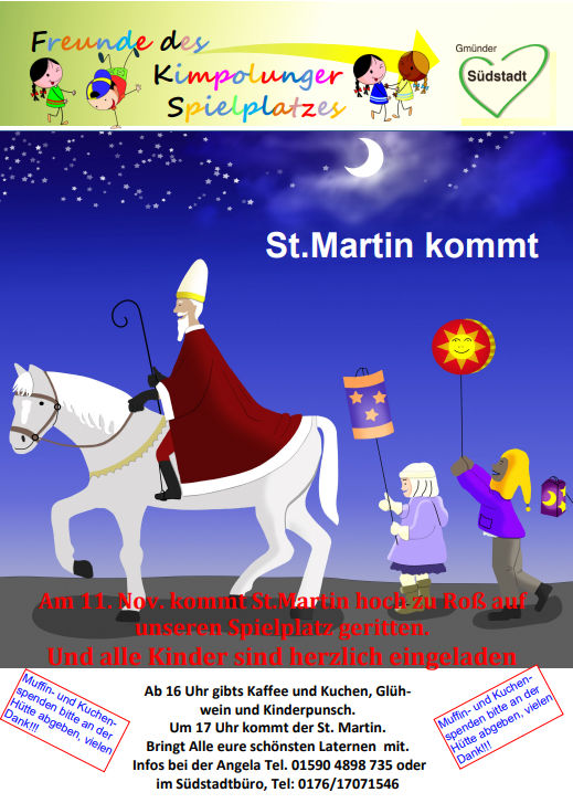 Schwäbisch Gmünd (sv). Die Südstadt lädt am Dienstag, 11. November zur traditionellen Sankt Martinsfeier auf dem Kimpolunger Spielplatz ein. Um 17 Uhr beginnt der feierliche Teil mit der Darstellung der Legende um St. Martin, gemeinsamem Gesang und dem anschließenden Laternenumzug. Für das leibliche Wohl sorgen bereits ab 16 Uhr wieder in bewährter Weise die "Freunde des Spielplatzes" mit heißem Punsch und leckerem Gebäck.