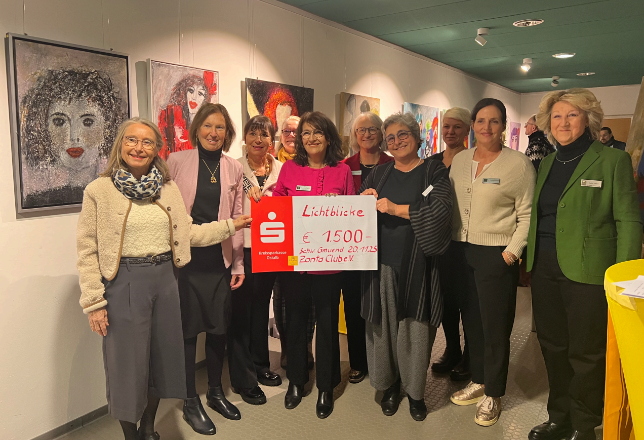 Schwäbisch Gmünd (sv). Im Rahmen der Vernissage des Zonta Clubs Schwäbisch Gmünd in der Galerie in der Spitalmühle wurde vom Zonta Club ein Scheck über 1.500 Euro für das Projekt "Lichtblicke - Aktiv gegen Altersarmut von Frauen" an Renate Wahl und Heike Özdemir von der Abteilung Senioren übergeben. Der Generationentreff in der Spitalmühle ist Anlaufstelle für dieses Projekt. Frauen ab 60 Jahren, die bedürftig sind, und unbürokratisch Hilfe benötigen, dürfen sich gerne an Frau Özdemir wenden. Die Beschenkten bleiben anonym. Lichtblicke ist ein Projekt des Zonta-Clubs Schwäbisch Gmünd e.V. Spendenkonto: Zonta Club Schwäbisch Gmünd E.V. , Iban DE73 61450050 1000 277997 Kreissparkasse Ostalb.