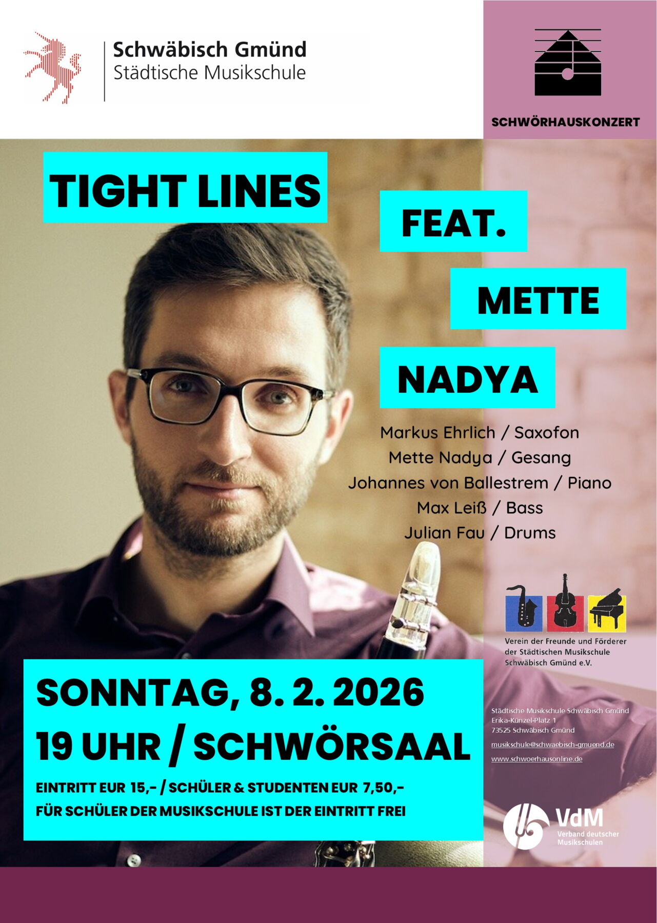 Schwäbisch Gmünd (sv). Markus Ehrlich ist am kommenden Sonntag, 8. Februar, mit seinem Jazz-Quartett „Tight Lines“ im Rahmen der Schwörhauskonzerte im Schwörsaal der Städtischen Musikschule zu hören. Es ist das erste SchwörhausKonzert mit dem Schwerpunkt Jazz. Im stimmungsvollen Ambiente präsentiert der Musiker mit seinem Ensemble „Tight Lines“ das aktuelles Jazzprogramm, das eigene Kompositionen und klangliche Entdeckungsreisen zwischen lyrischer Melodik, moderner Jazzsprache und energiegeladenen Grooves umfasst.
