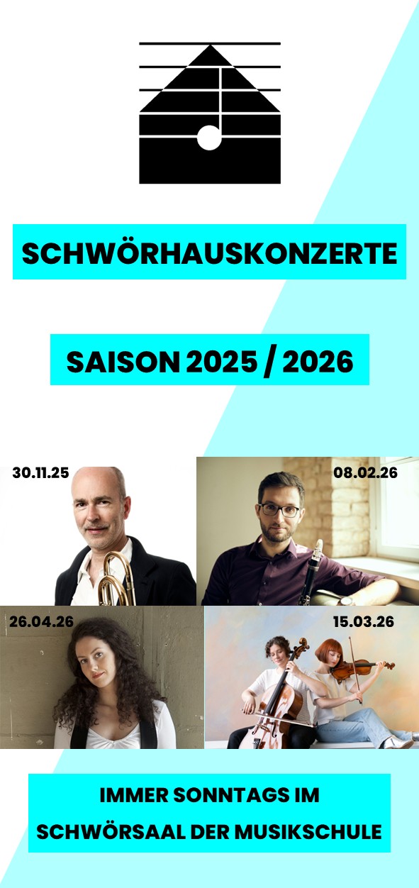 Auch in der neuen Saison garantieren die gemeinsam von der Städtischen Musikschule und dem Förderverein der Musikschule präsentierten SchwörhausKonzerte hervorragende musikalische Qualität und persönliche Nähe zu den Interpretinnen und Interpreten. Die Veranstaltungen beginnen jeweils um 17 oder 19 Uhr.
