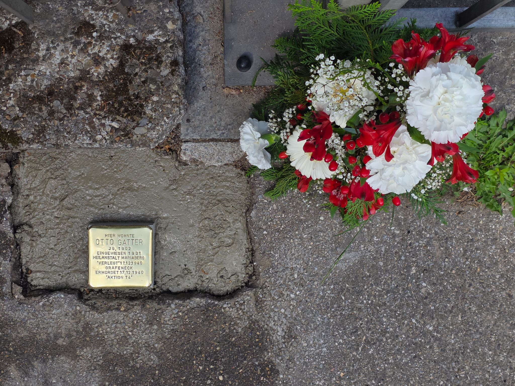 An die Gmünder Opfer der „Aktion T 4“ erinnert in allgemeiner Form das Mahnmal für die Opfer der „Euthanasie“ in der Grabenallee sowie einzelne Namen auf der Gedenktafel am Kulturzentrum Prediger. Um das Gedenken an diese Opfergruppe weiter zu stärken und zu individualisieren, wurde am Montag, 26. Mai, in Schwäbisch Gmünd nun ein weiterer Stolperstein für Otto Gatter (1902-1940) gesetzt. Der jüngste Sohn des Gießereifabrikanten Ferdinand Gatter wohnte in der Mutlanger Straße 28, bei seinem Vater bis zu dessen Tod im Jahr 1930. Ab 1931 lebte er in Mariaberg, einem ehemaligen Kloster bei Gammertingen, wo 1846 eine Heil- und Pflegeanstalt für geistig Behinderte eingerichtet worden war. Nach Beginn der „Aktion T4“ wurde der Großteil der Pfleglinge aus Mariaberg in zwei Transporten am 1. Oktober und 13. Dezember 1940 nach Grafeneck transportiert und dort ermordet. Otto Gatter starb vier Tage nach seiner „Verlegung“ am 17. Dezember 1940.