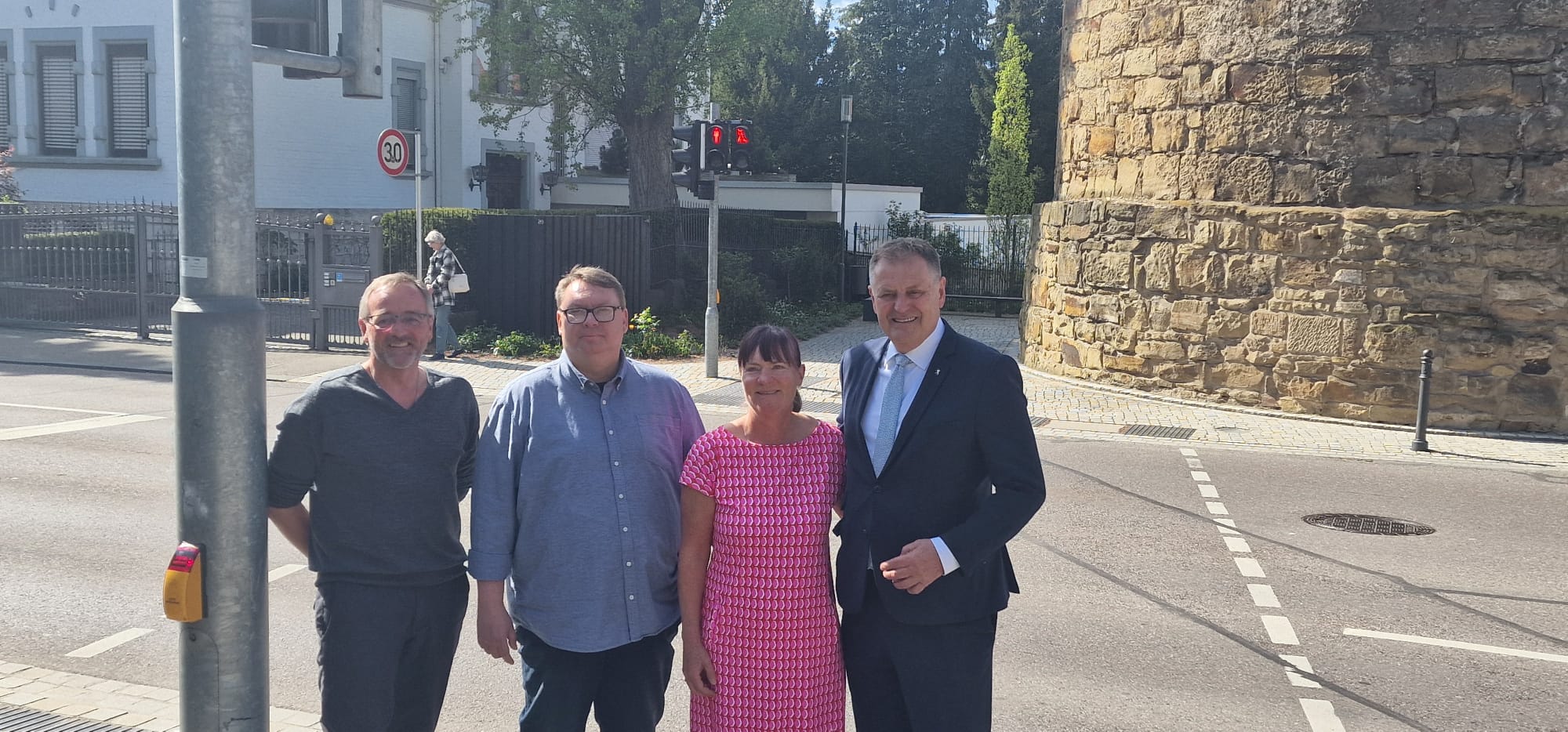 Durch die Spende von Gemeinderätin Dr. Birgit Stahl wurde die zweite Einhorn-Ampel möglich gemacht. Oberbürgermeister Richard Arnold, Jürgen Musch, Leiter des Tiefbauamtes und Andrzej Sielicki, Arbeitskreis Mobilität und Verkehr, freuten sich die weitere Signalanlage auch an diesem viel frequentierten Übergang mit dem Gmünder Einhorn leuchten zu sehen und bedankten sich bei Dr. Birgit Stahl für die Spende.