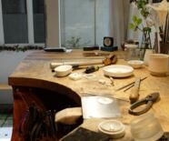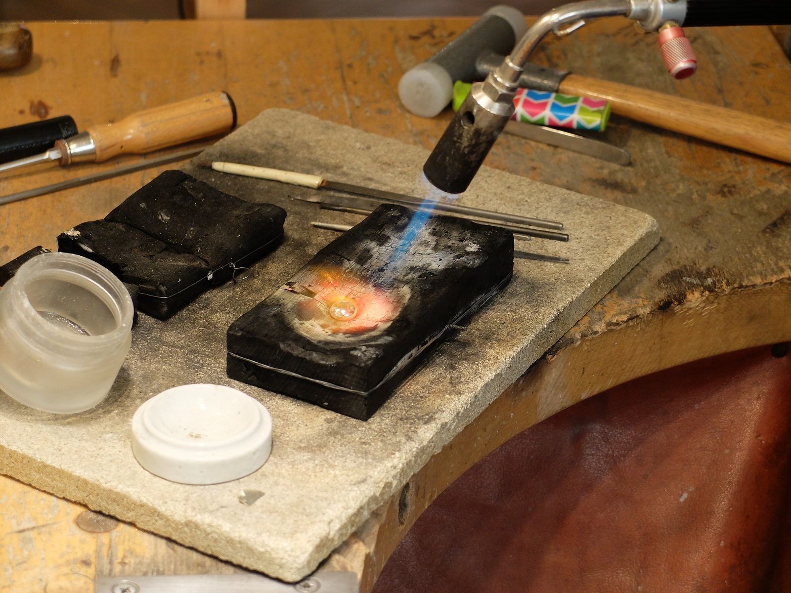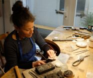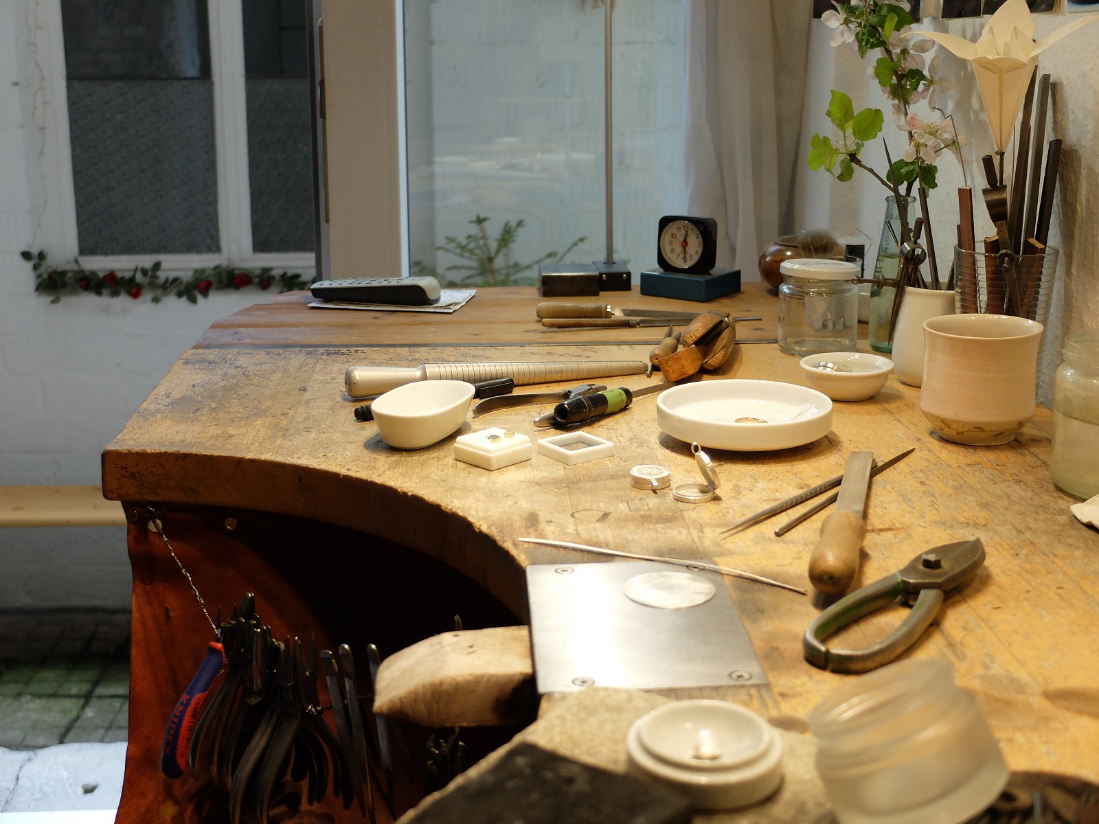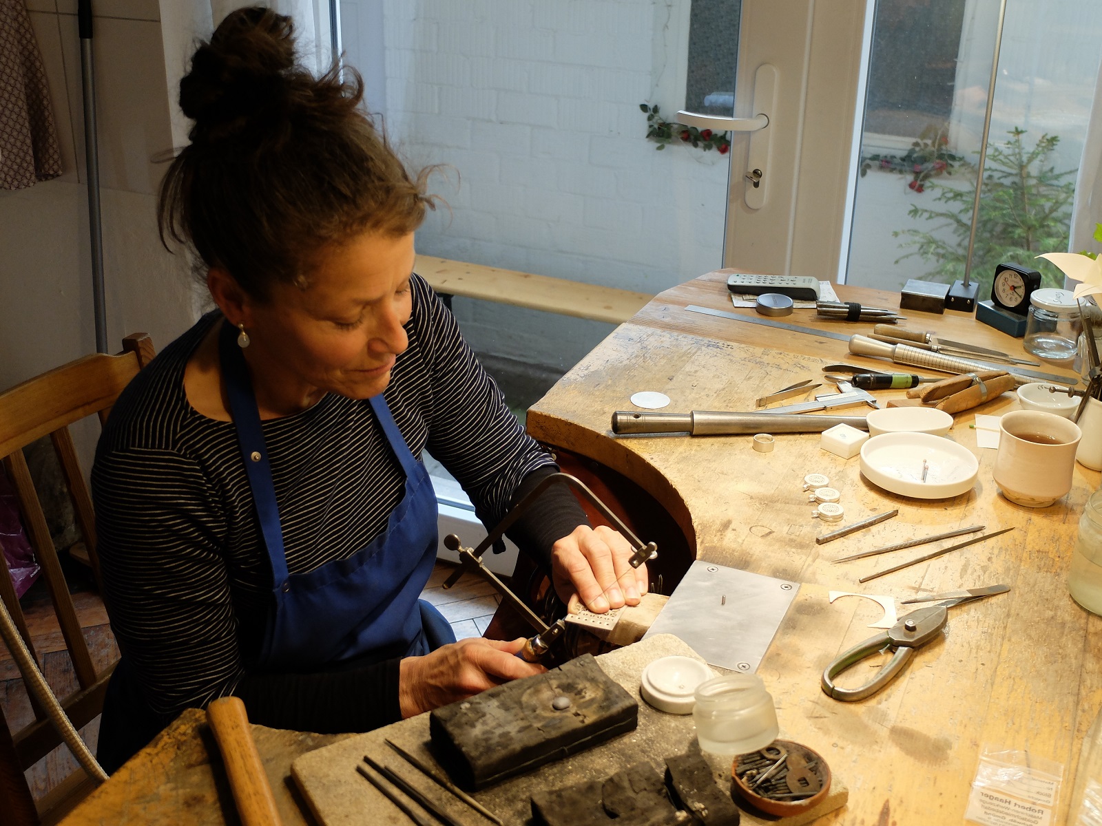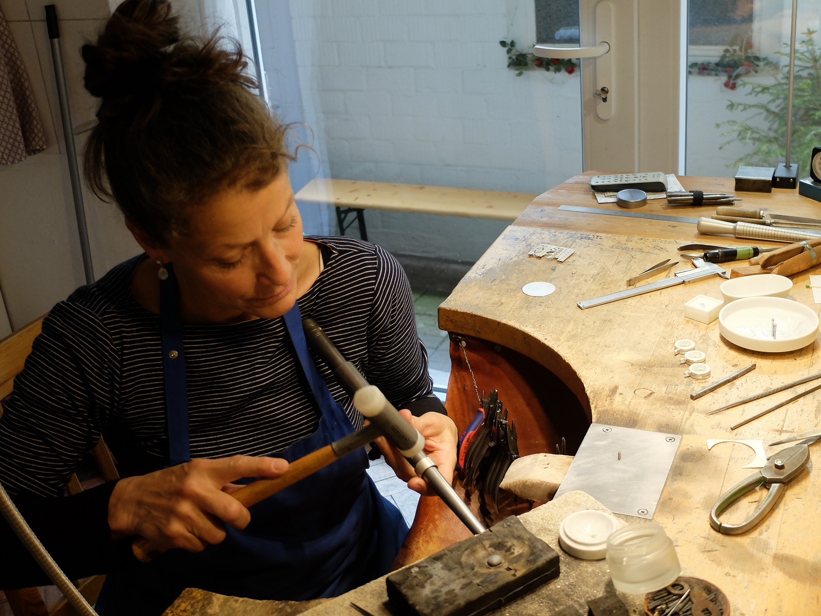 In ihrem Atelier bietet sie außerdem Schmuckdesign-/und Goldschmiedekurse an.