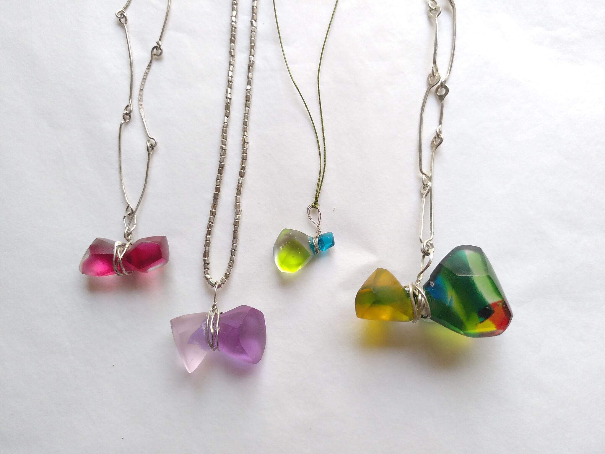 Zu den aktuellen Arbeiten von Alkie Osterland gehören Broschen, die Edelsteine mit Glassteinen kombinieren und lange wechselvolle Colliers.