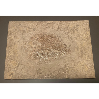 Der Schmelzschuppenfisch stammt aus dem Posidonienschiefer von Holzmaden; ovaler Körper, Kopf ist breit mit einer abgerundeten Schnauzenpartie, Schuppen sind durch eine glänzende Schmelzschicht verstärkt.