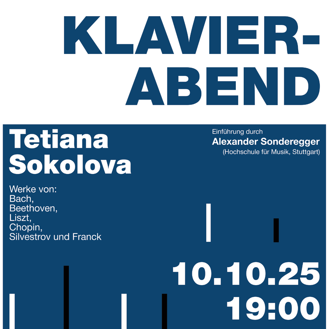 Tetiana Sokolova studiert im Masterstudiengang Soloklavier an der Staatlichen Hochschule für Musik und Darstellende Kunst Stuttgart in der Klasse von Alexander Sonderegger. Herr Sonderegger wird eine Einführung in die Werke geben.