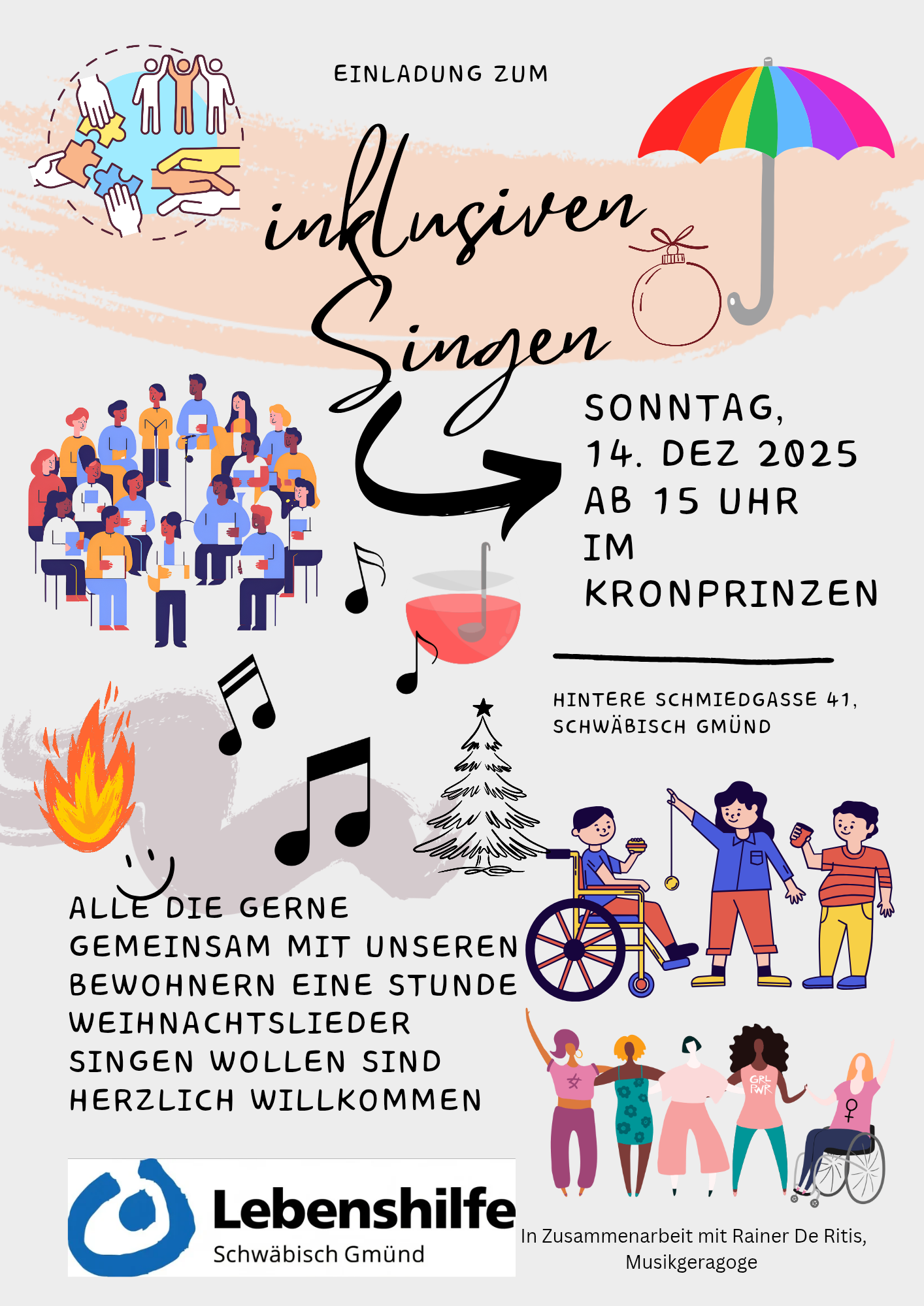 Am Sonntag, den 14. Dezember 2025 um 15 Uhr lädt die Lebenshilfe Schwäbisch Gmünd herzlich zum inklusiven Singen ein. Gemeinsam mit unserem Chor „ChörLE“ und unter der musikalischen Leitung von Rainer de Ritis, Musikgeragoge, erwartet die Besucherinnen und Besucher eine besinnliche Stunde voller Musik, Gemeinschaft und Adventsstimmung.