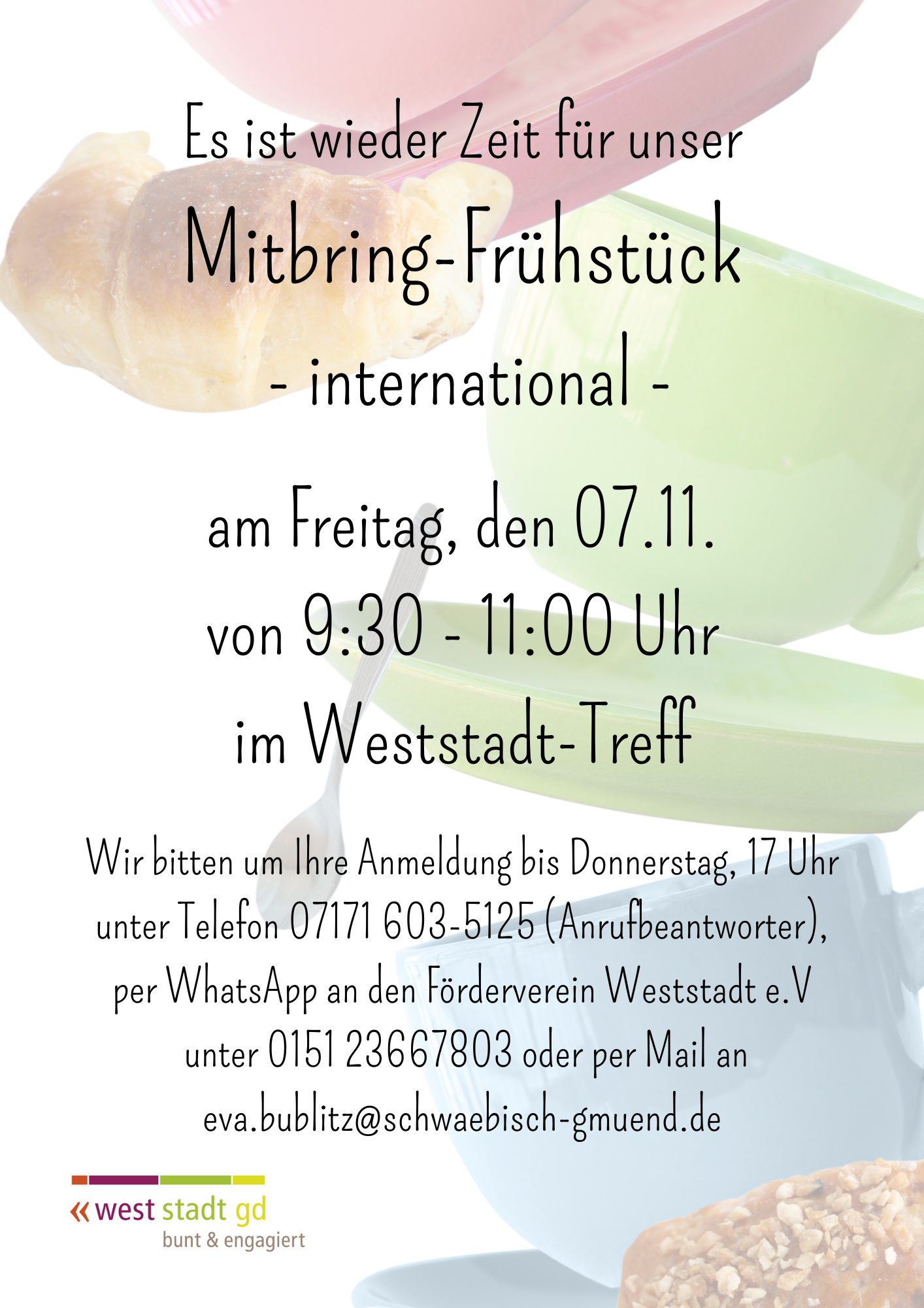 Es ist wieder Frühstückszeit im Weststadt-Treff am Bildungs- und Begegnungszentrum Stauferschule (BBS) im Heinrich-Steimle-Weg 1! Das ehrenamtliche Team um Leyla Bay, Stadtteilkoordinatorin Eva Bublitz und den Förderverein Weststadt e.V. freuen sich, am Freitag, den 07. November zwischen 9:30 Uhr und 11 Uhr unter dem Motto „alle bringen was Leckeres mit und dann gibt’s Frühstück“ mit Ihnen am großen Tisch zu sitzen, zu essen und zu plaudern. Um besser planen zu können, bitten wir um Ihre Anmeldung bis spätestens Donnerstag, 17 Uhr unter der Telefonnummer 07171 603-5125 (mit Anrufbeantworter), per WhatsApp an den Förderverein Weststadt e.V. unter 0151 23667803 oder per Mail an eva.bublitz@schwaebisch-gmuend.de. Zur Deckung der Unkosten für die Getränke bitten wir um eine kleine Spende ins Spendenschwein.