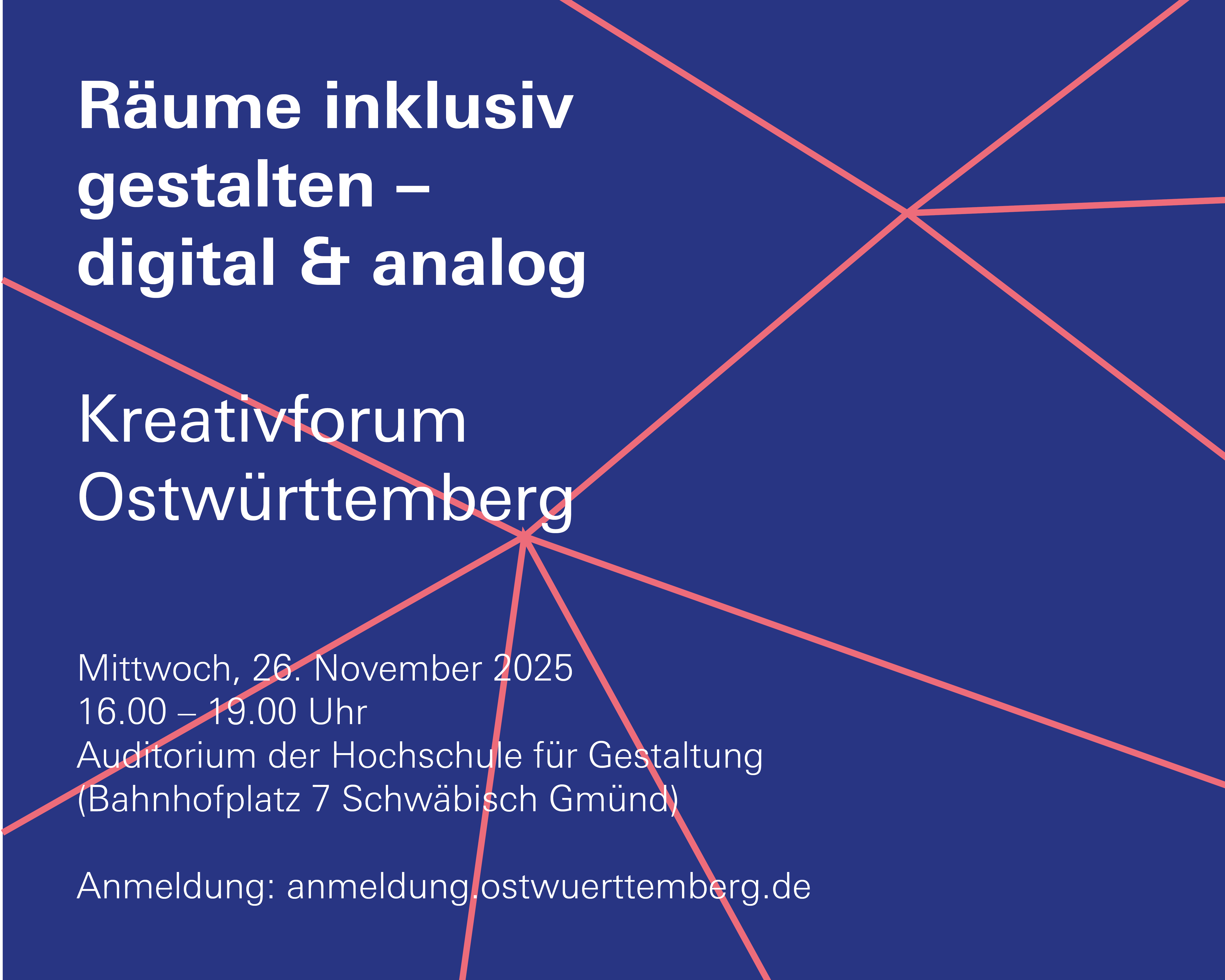 Unter dem Titel „Räume inklusiv gestalten – digital & analog“ lädt das Kreativforum Ostwürttemberg am 26. November 2025 zu einem in-spirierenden Nachmittag an die Hochschule für Gestaltung in Schwäbisch Gmünd ein. Im Fokus steht die Frage, wie analoge und digitale Räume, Produkte und Dienstleistun-gen so gestaltet werden können, dass sie für alle Menschen zugänglich sind.