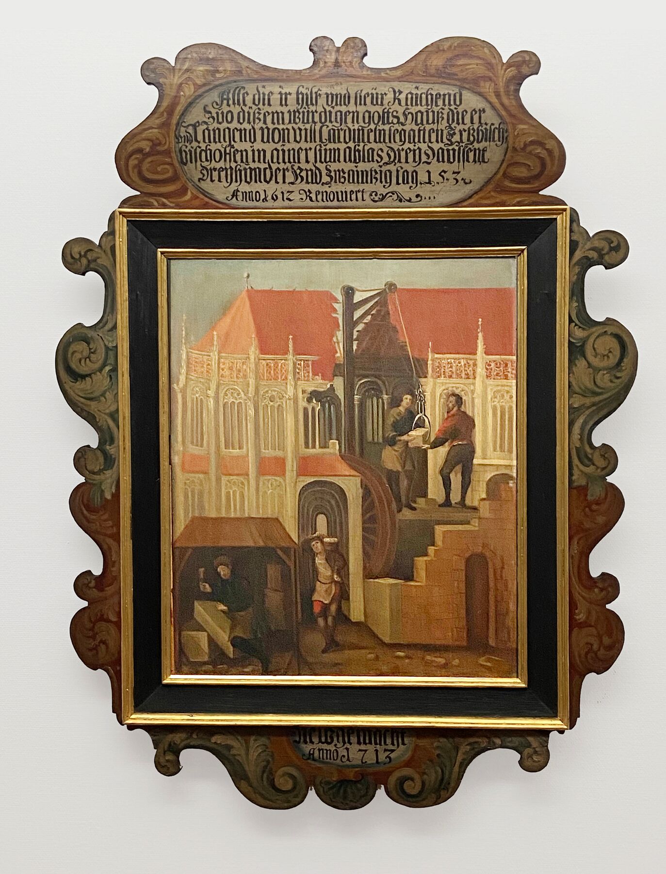 Sie gehört zweifelsohne zu den ausgefallensten und zugleich sprechendsten Bildwerken im Gmünder Museum: die Ablasstafel aus dem Jahr 1503. Zum einen zeigt sie Handwerker bei der Instandsetzung des Heiligkreuzmünsters nach dem Einsturz der Kirchtürme 1497 – und bezeugt so lebendig das Arbeiten einer mittelalterlichen Bauhütte. Zum anderen wirbt sie auf einer Inschrift über dem Bild für den Wiederaufbau der Kirche mit dem Versprechen, dafür Sündenstrafen erlassen zu bekommen – und ist damit Dokument mittelalterlicher Frömmigkeit. Zu lesen ist dort: Alle die ir hilf und steür Raichend zuo dißem wiirdigen /gottsHauß die erlangend von vill Cardineln legatten / Ertzbischoff: und bischoffen in ainer sum ablas / DreyDaussent DreyhnnderUndZwaintzig tag.