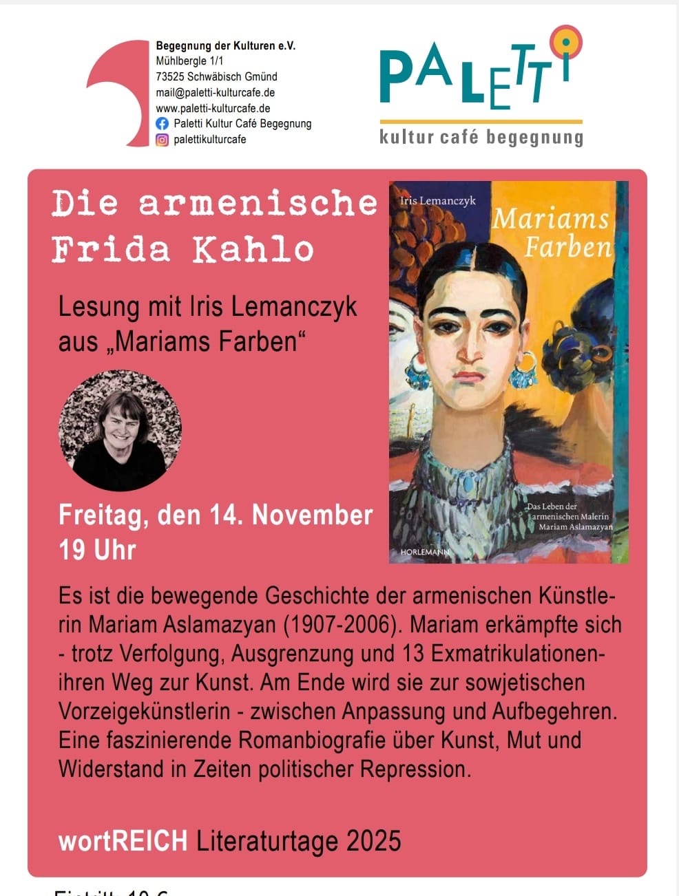 Lesung mit Iris Lemancyk über die Malerin Mariam Aslamazyan, die mit beinahe 100 Jahren gestorben ist. Ihre Lebensgeschichte und ihre Wege in die Kunst werden in dem Roman beschrieben.